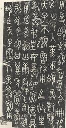 | Keywords: JinwenShisongding.jpg Part of a rubbing of bronze script engraved on the Song ding 颂鼎 <ref>http //www chinese cn/treasure/en/article/2009-08/26/content_14192 htm Song Tripod Song Ding August 26 2009 The Palace Museum Beijing </ref> The text records the appointment of a man named Song 颂 as supervisor of the storehouses in Chengzhou and is repeated on at least 3 tripod pots 鼎 dǐng 5 tureens 簋 guǐ and their lids and 2 vases 壺 hú and their lids <ref>Kern Martin 2007 The performance of writing in Western Zhou China in The poetics of grammar and the metaphysics of sound and sign S La Porta and David Dean Shulman eds BRILL pp 109 175 ISBN 978-90-04-15810-8 Discussion and images of the various versions on pp 141 144 </ref> The full text is with added punctuation <blockquote>唯三年五 既死 ,甲戌,<br/> 王 周康卲宮,旦,王格大<br/> 室,即立 宰弘右頌入 ,立<br/> 中廷 尹氏受王命書 王呼<br/> 史虢生冊命頌 王曰: 頌,令<br/> 官司成周貯廿家,監司<br/> 新 貯,用宮御 錫 玄衣<br/> 黻純,赤巿 鑾旂 攸勒<br/> 用事 頌 稽首,受命冊,佩<br/> 以出 返入覲璋 頌敢對揚<br/> 天子丕顯魯休,用 皇<br/> 龔叔 皇母龔姒寶尊鼎,<br/> 用追 祈介康 純右 <br/> 祿永令,頌其萬年 壽,<br/> 畯臣天子, 終,子子孫孫寶用 </blockquote> The original text indicates repetition of the characters 子 and 孫 in the last line using iteration marks The text is dated the 5th month of the 3rd year of an unnamed king Shaughnessy identifies the king as Xuan implying a year of 825 BC <ref>Shaughnessy Edward L 1999 Western Zhou history in Loewe Michael; Shaughnessy Edward L The Cambridge History of Ancient China Cambridge Cambridge University Press pp 292 351 ISBN 978-0-521-47030-8 Translation on pp 298 299 </ref> The image is copied from an old Chinese book published before the Chinese copyright law was set up Calco de un jarrón de bronce de hacia el 900 adC References <references/> PD-old Bronze script Palace Museum Iteration mark |