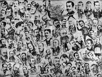 | Keywords: Jiquidi - 100 tipuri din România.jpg 100 tipuri din România Pe partea stanga a planşei în rânduri dela stânga spre dreapta I - Grigore Ventura la pian - Dr G Asaki - Nicolae Velescu - Roco - Em Protopopescu - Pache şi Iancu Brătescu-Decalitru pe butoi II Dr George Stoicescu - Matei Millo - Mihail Cogâlniceanu curcan - Ion C Brătianu - Titu Maiorescu III Aristița Romanescu - Ciru Economu - - Dumitru C Brătianu - - Hitrovo IV - Gh din Moldova Kerembach - Principele Bibescu clopot - Andrei Popovici fabrica de spirt - Dr Victor Babeș - Nae Ulmeanu seful bătătușilor electorali ai liberalilor - C A Rosetti V Generalul George Manu - Ștefan Bellu - Dr Petrini Paul - Principele Dimitrie A Ghica - Beizadea Mitică pe un dovleac - Ion L Caragiale - Constantin Nacu - Alexandru Lahovary banditul Licisnski și Dr Petrini-Galați VI Petrache Grădișteanu - Theodor Sperantia - Grigore Manolescu în Hamlet -- Dr N Kalenderu - arhitect Ion Mincu - Grigore Brătianu - Radu Mihai și G Costaforu Adevârul VII Simeon Mihăilescu - Tudoriță Rosetti - generalul Ion Em Florescu floare'n ghiveciu - general Dr Demostene Cu trombonul - tipograful Iosef Göbl - Alexandru Marghlloman pe cal delemn Dr C Severeanu meșter lacatuș - Grigore Peucescu și I Popovici-Răcăciune VIII Tache Gianni - Ionică Fălcoianu cobzar - Laurian - - Constantin Nottara și Dr Felix eșind din canal Pe parted dreaptă a planșei in randuri dela stânga spre dreapta I Constantin Jicquidi autorul planșelor - Gr Alexandrescu - - Gheorghe Mârzescu II Niculache Gherassy prim-presedinte la Casație cu fustaneldă - Dr N Mdlddrescu Niculae Cămărășescu - Ștefan Iulian tatăl în Jupan din Voevodul Țiganilor - Sculptorul C Georgescu - iar pe paletă pictorii B Panaiteanu - Dumitru Mirea - Theodor Aman și Nicolae Grigorescu III Al V Beldiman Cu pana si Adevărul B P Hasdeu - - Vasile Alecsandri cu lyra IV Ion Ghica Luiggi Cazavillan Universul Ion Creangd Ion Slavici si Dr Râmniceanu V Ștefan Sihleanu în fluture - Papamihalopol - Lascăr Catargiu in rac - Georges Cosman ca sticlă de vin și Petre Poni VI Petre P Carp în Don Quichotte - Nicu Metz - Al Cantacuzino cel cu Azilul copiilor gasiți - C Olmazoglu moard de vânt - Popa Tache șeful bătăușilor electorali ai onservatorilor - Claymoor Mihail Văcărescu - - și V A Urechiă George Costescu Bucureştii vechiului regat Ed Universul 1941 Creator Constantin Jiquidi PD PD-old-100 Constantin Jiquidi Romania in the 19th century |