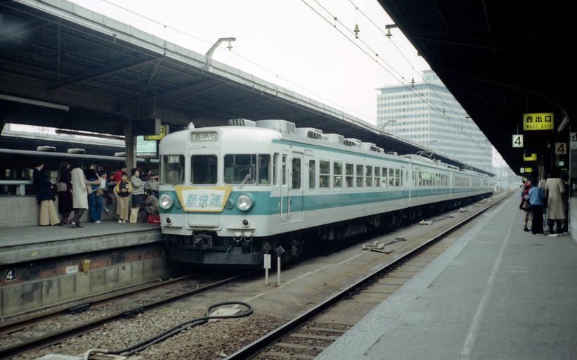 | Keywords: JNR SHIN KAISOKU at OSAKA 153.jpg  A JNR 153 series EMU at Osaka Station on a Special Rapid service ja 国鉄 新快  153系 撮影箇 大阪駅 撮影昭和53年 own h-tori 1978 1978 in rail transport in Japan JNR 153 Trains at Osaka Station Special Rapid Services on Tōkaidō Main Line JR West Train headboards in Japan Blue and white rail vehicles Blue stripes |