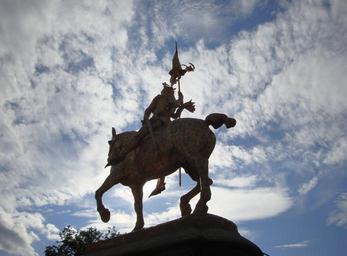Keywords: joan arc saint statue silhouette clouds soldier warrior woman heroine horse horseback banner