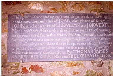 | Keywords: Joan, Lady of Wales, grave.jpg en Slate panel above grave of Joan Lady of Wales Beaumaris Church Anglesey own Cate228 1999-05 Church of St Mary and St Nicholas Beaumaris monuments Joan Lady of Wales May 1999 in Wales Churches in Wales photographed in 1999 May 1999 photographs Plaques referencing 1237 Plaques referencing 1808 |