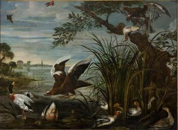 | Keywords: Joannes Hermans (atrr.) - River Scene with Ducks and Geese being attacked by Hawks.jpg Attributed to title River Scene with Ducks and Geese being attacked by Hawks 1645-1650 Kedleston Hall National Trust http //www nationaltrustcollections org uk/object/108906 oil canvas cm 163 8 208 3 PD-old-100 Joannes Hermans Paintings in Kedleston Hall Still-life paintings with living parrots | ||||