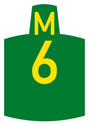 Keywords: Joburg road M6.svg en Johannesburg M6 road sign own Htonl based on the SADC Road Traffic Signs Manual Volume 4 page 4 3 13 2016-03-23 Signs for roads numbered 6 Diagrams of metropolitan road number signs of Johannesburg
