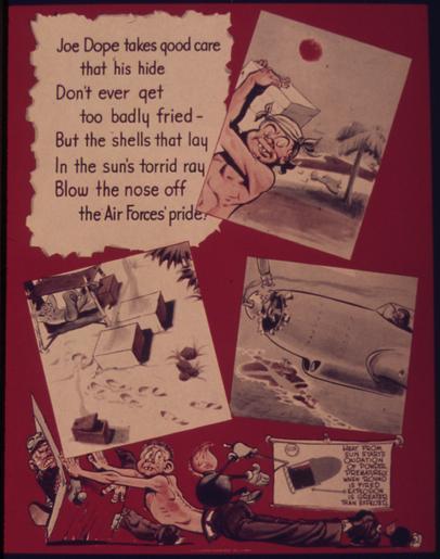 Keywords: "Joe Dope takes good care that his hide Don't ever get too badly fried" - NARA - 514692.tif Scope and content General notes 514692 Local identifier 44-PA-1143CC Office for Emergency Management Office of War Information Domestic Operations Branch Bureau of Special Services 03/09/1943 - 09/15/1945 NARA-Author Eisner Will 1917- Artist 1835939 <br /> Still Picture Records Section Special Media Archives Services Division NWCS-S National Archives at College Park 8601 Adelphi Road College Park MD 20740-6001 1941 - 1945 Record group Record Group 44 Records of the Office of Government Reports 1932 - 1947 Record group ARC 373 World War II Posters compiled 1942 - 1945 Series ARC 513498 File unit File unit ARC Variant control numbers NAIL Control Number NWDNS-44-PA-1143CC yes Other versions <gallery> File Joe_Dope_takes_good_care_that_his_hide_Don't_ever_get_too_badly_fried _-_NARA_-_514692 tif tif File Joe_Dope_takes_good_care_that_his_hide_Don't_ever_get_too_badly_fried _-_NARA_-_514692 jpg jpg </gallery> NARA-cooperation PD-USGov World War II posters from the United States NARA TIF images with categorized JPGs |