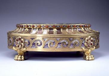 | Keywords: Johann Christian Neuber - Stand or socle for a figural group - Walters 541909 (2).jpg The tradition of mounting specimen stones can be traced to 16th-century Florentine pietra dura work In the late 1700s techniques for slicing and polishing stones were perfected allowing lapidaries most notably the Dresden goldsmith Johann Christian Neuber 1736-1808 to produce masterpieces in which concentric radiating patterns of specimen hardstones were set in lids of snuffboxes and circular tabletops In this work the skeleton of the container is in gilded bronze with Roman motifs including scroll patterns paterae saucer-shaped appliqués and paw feet The body is lined with sheets of pink amethyst with traces of fluorite and the rim is decorated with alternating carnelians and foil-backed amethysts Set in the frame are sheets of dark brown agate light brown spotted petrified wood tan agate pink agate and white marble The paterae have centers of banded agate and borders of jasper late Other date century 18 gilded bronze amethyst agate jasper petrified wood carnelians marble cm 16 5 48 9 41 accession number 54 1909 34494 Frédéric Auguste III 1750-1827 Elector of Saxony date and mode of acquisition unknown Nicolai Wasilijewitsch Repnin 1732-1801 1779 by gift with thanks for his role in the negotiation of the Peace Treaty of Teschen Alexandre Polovtsoff Aleksandr Aleksandrovich Polovtsov Paris date and mode of acquisition unknown Henry Walters city Baltimore Walters Art Museum Henry Walters Acquired by Henry Walters 1929 The Fabergé Menagerie The Walters Art Museum Baltimore; Columbus Museum of Art Columbus; Portland Art Museum Portland 2003-2004 place of origin Dresden Germany <gallery> File Johann Christian Neuber - Stand or socle for a figural group - Walters 541909 jpg </gallery> Walters Art Museum license Bronze objects Animal feet in art Johann Christian Neuber Collections of the Walters Art Museum Nicholas Repnin |