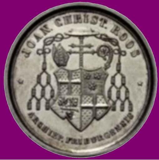 Keywords: Johann Christian Roos RS.jpg Gedenkmedaille v G Arnold 1886 zur Inthronisation Johann Christian Roos zum Erzbischof von Freiburg Silber 32mm 13 29 gr RS Bischofswappen NumisBIDS 2013 G Arnold Christian Roos PD-old