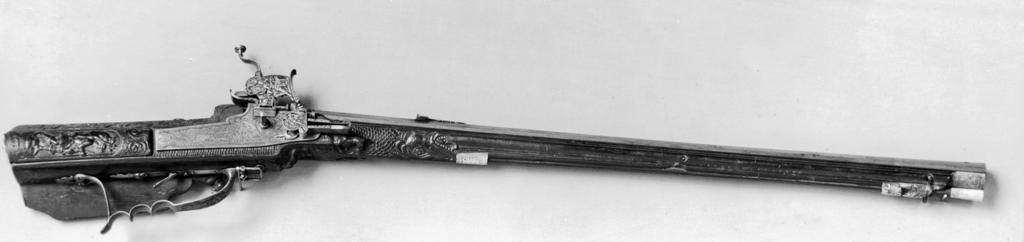 Keywords: Johann Michael Maucher - Pistol - Walters 51586.jpg Maucher whose initials are on the stock was a carver as well as stock maker The stock is carved in relief with motifs of a hunter with his rifle and a young woman who carries a hunting hawk on her arm a favorite form of hunting for women and a spear In the 1600s women did not hunt with spears; rather this alludes to the Roman goddess Diana who hunted with a spear and whose exploits and virtues validated hunting for its adherents The original lock a wheel-lock was later replaced with a Prague flintlock made in the 1700s 1670 steel or iron walnut with bone or antler inlay copper alloy cm 110 5 accession number 51 586 16617 Richard Zschille Grossenhain Saxony Henry Griffith Keasbey New York date and mode of acquisition unknown Sale American Art Association New York 1924 no 265 Henry Walters Baltimore 1924 mode of acquisition unknown Walters Art Museum Henry Walters Acquired by Henry Walters 1924 place of origin Schwabisch-Gmund in present-day Germany Walters Art Museum license Weapons in the Walters Art Museum Baroque art in the Walters Art Museum Johann Michael Maucher Media contributed by the Walters Art Museum needs category review |