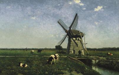 Keywords: johannes-hendrik-weissenbruch art painting oil on canvas landscape windmill sky clouds nature outside cattle summer spring country countryside