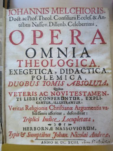 | Keywords: Johannes Melchior Opera Omnia.JPG en Opera Omnia Theologica Exegetica Didactica Polemica Duobus Tomis Absoluta quibus Veteris ac Novi Testamenti libri conferuntur explicantur illustrantur Veritas Religionis Christianae ¦ Argumentis validissimis asseritur defenditur Triplici Indice Locupletata ¦ Johann Nicolai Andreae Herborn 1693 Signature AB 33 13 de Tietelblatt von Opera Omnia Theologica Exegetica Didactica Polemica Duobus Tomis Absoluta quibus Veteris ac Novi Testamenti libri conferuntur explicantur illustrantur Veritas Religionis Christianae ¦ Argumentis validissimis asseritur defenditur Triplici Indice Locupletata ¦ Johann Nicolai Andreae Herborn 1693 Signatur AB 33 13 own Reinhard Dietrich 2016-03-17 Cc-zero Johannes Melchior |