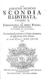 | Keywords: Johannes Messenius ScondiaIllustrata 1703.jpg Cover of the book 'Scondia illustrata Tomus X ' written 1628-1636 by Johannes Messenius in prison of Kajaani Castle Finland Public library of Oulu Finland http //www ouka fi/kirjasto/oulunarkki/kirjat/5334scondia_illustrata_tomus_x pdf Original work published on 1703 Original work by Olavi Enaei Stockholm Sweden 1703 PD-old Johannes Messenius History of Sweden History of Finland | ||||