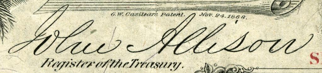 Keywords: John Allison (Engraved Signature).jpg en Engraved signature on U S Bank Notes “ paper currency 2012-12-26 www nationalcurrencyfoundation org Bureau of Engraving and Printing Smithsonian Institution PD-USGov Engravings Signatures on United States Banknotes Smithsonian Institution Currency National Numismatic Collection Banknote signatures scanned by User Godot13 |