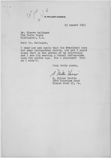Keywords: John F. Kennedy and Button Down Shirts - NARA - 194138.tif Scope and content Inquiry concerning President Kennedy wearing a button down shirt General notes 194138 Local identifier President 1961-1963 Kennedy Office of the President 01/20/1961 - 11/22/1963 John F Kennedy Library NLJFK Columbia Point Boston MA 02125-3398 1963-08-23 Record group Collection JFK-WHCF Papers of President Kennedy White House Central Files 01/20/1961 - 11/22/1963 Record group ARC 1176 Papers of President Kennedy White House Central Files White House Subject File compiled 01/20/1961 - 11/22/1963 Series ARC 194123 File unit Papers of President Kennedy White House Central Files White House Subject Files President 01/20/1961 - 11/22/1963 File unit ARC 194135 Variant control numbers NAIL Control Number NLK-WHCF-SBJCTFL-PP1310GWEARAPP-LTRREJFKSHIRT yes Other versions NARA-cooperation PD-USGov Pierre Salinger Documents related to John F Kennedy |