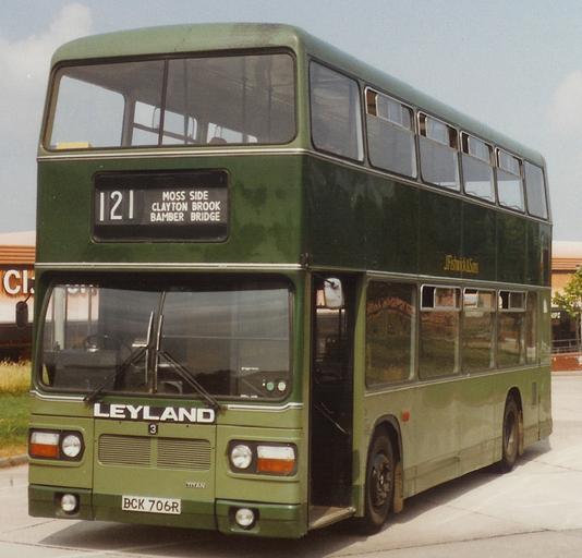 | Keywords: John Fishwick & Sons bus 3 (BCK 706R) 1977 Leyland Titan B15 prototype 05.jpg John Fishwick and Sons bus 3 reg BCK 706R a Leyland Titan B15 pictured operating the w Lancashire based operator's route 121 The exact date and location is not known See the wider image for possible location clues The bus was operated by Fishwicks during the 1980s until late 1987 This bus was the 5th of the five pre-production Titans built by British Leyland subsidiary Park Royal Vehicles in Park Royal London They also built the first batch of production buses until production switched to Leyland's expanded factory in the Lillyhall Industrial Estate Workington It was built in June 1977 and numbered B15 05 the name Titan not having been adopted as yet It had chassis number 7703050 but was redesignated 7705689 in the same month It was outshopped in plain red livery with black skirt It was in dual door highbridge 44 seat upstairs 27 down configuration production buses were mostly H44/22 In the grille area it had body coloured rounded headlight surrounds black inside which were visually separate from the understated flat radiator panel also body coloured This contrasts with the design used on production buses where the headlight surrounds and panel were styled into a continuous rectangular horizontal element painted black with smaller/narrower indicator/side lights It also had a prominent white lettered LEYLAND badge mounted directly beneath the front windscreen Hired by London Transport it was tested at Chiswick Works for 3 months and then entered trial service out of Chalk Farm garage code CF on routes 3 24 by which time it had also received further badges the 'dustbin lid' circular Leyland 'L' on the radiator grille and left rear and a small rectangular lettered Titan badge on the radiator grille panel corner and rectangular lettered Leyand Titan badges on the right rear It was also slightly repainted receiving a white surround along the upper deck windows losing the black skirt on the sides and rear but not front and gaining the white London Transport roundel on the offside staircase By October 1978 it had been returned to Leyland after which it also saw demonstrator service at other operators including Preston and Tayside who applied fleetnumber 100 It carried the same livery at these operators as in the London service but without the white roundel replaced by a large Leyland L logo applied above the driver's side window By 1981 it was on loan with Merseyside PTE wearing their full green/cream/black 'Merseyside Transport' livery and fleetnumber 0029 By this time the circular L grille badge had dissappeared At some point it was bought outright by Fishwicks who also took 2 of the other prototypes They painted it in their two tone green livery as seen here and gave it fleet number 3 By this time it had also lost its centre door possibly by MPTE In December 1987 it was purchased by London Buses division Selkent the arms-length operator covering south east London set up as part of the deregulation and privatisation process By this time Titan production had ended and sales outside London had been minimal The production Titans had in the vast majority been delivered new to London Transport numbered in their T-class series allocated to garages around the east and south east This bus was allocated T-class fleetnumber T1131 becoming the last numerical T-class No s T1-T1125 were new No s T1126-T1130 were allocated to Titans bought by London Transport second hand from West Midlands PTE in 1984 It entered service in the London Buses livery of the time allover red with grey skirt white cantrail line yellow door and with white/orange/red 'London Buses' lettered roundel The large LEYLAND badge on the front was removed presumably to make way for the 'pay driver/pay conductor' flap sign It instead received the now standard smaller stylised lettered Leyland badge on the radiator grille which was painted grey to match the inside of the headlamp surrounds but otherwise being allover red in contrast with the black stripe of production buses In April 1991 it was returned to Leyland for repainting and to receive a new engine returning a month later While at Selkent it also lost its rounded front light clusters in favour of the more rectangular production versions although there were not combined with the standard radiator grille In keeping with the earlier scheme these were also painted outer red/inner grey In February 1992 it was re-registered with cherished plate VLT 240 removed from the withdrawn 1960 built Routemaster RM250 which was scrapped in July 1992 In March 1993 in preparation for disposal it was re-registered again as TMX 535R and placed into store Two months later it was sold to a dealer who passed it on to Blue Triangle who repainted it into their livery In the next few years it saw further service with Beestons of Hadleigh Universitybus of Hatfield in white livery and Aintree Coachlines of Bootle numbered A5 By May 1997 it had been bought for preservation by Fishwick being re-registered to its original plate At some point it was restored to the livery of its original London loan period although the white LEYLAND badge was merely painted on By the 2000s this red scheme had become faded and the bus was put into a restoration program seeing the removal of nearly all the bodywork panels Crop of File Leyland Titan B15 05 jpg circa 1980 s Uploaded to Wikipedia by RXUYDC Transferred to Commons by User Oxyman using http //tools wikimedia de/~magnus/commonshelper php CommonsHelper Cropped by User Ultra7 Released into the public domain by the author other versions Leyland Titan B15 05 jpg en wikipedia RXUYDC John Fishwick and Sons bus company Buses in the United Kingdom photographed in unknown locations Buses in the United Kingdom with an unknown photography date Public transport buses in the United Kingdom Demonstrator buses in the United Kingdom Leyland Titan B15 buses in the United Kingdom 0000 05 R suffix registe