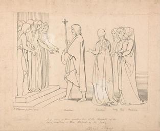 | Keywords: John Flaxman - Illustration to Pilgrim's Progress - Google Art Project.jpg <nowiki>Inscribed in gray ink lower center Christian Discretion Charity Piety Prudence ; in gray ink lower center And many of them meeting turn at the threshold of the house said Come in Thou Blessed of the Lord; Pilgrim's Progress </nowiki> Inscription _Signed_and_Dated Signed and dated in gray ink lower left J Flaxman 8 June 1792 Not on view Black ink on medium slightly textured cream wove paper women crosses motifs men ceremonies procession steps robes historical subject special url_id JQF8IBNPOY48-w PD-old-100-1923 1826 John Flaxman Google Art Project works by John Flaxman Pilgrim's Progress |