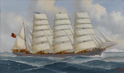 | Keywords: John Henry Mohrmann - The four-masted barque 'Cedarbank' at sea under full sail (1896).jpg John Henry Mohrmann 1857-1916 date 1896 oil on canvas cm 59 7 100 3 object history credit line H Mohrmann 1896 lower right signature / date accession number http //www bonhams com/auctions/14977/lot/64/ Bonhams London 11 Sept 2007 lot 64 PD-old-auto-1923 1916 John Henry Mohrmann sailing ships in paintings Cedarbank ship 1892 Images from Bonhams | ||||