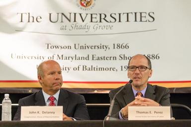 | Keywords: John K. Delaney and Thomas Perez, 2014.jpg 02 September 2014 - Secretary of Labor Thomas Perez attended a workforce development forum with Congressman John Delany Also on the panel was Dr Stewart Edelstein Executive Director of the Universities at Shady Grove; Dr DeRionne Pollard President of Montgomery College; Diego Uriburu Executive Director of Identity Inc; and Patrick Caulfield co-owner of Coakley Williams Construction Inc Official Department of Labor Photograph This official Department of Labor photograph is being made available only for publication by news organizations and/or for personal use printing by the subject s of the photograph The photograph may not be manipulated in any way and may not be used in commercial or political materials advertisements emails products and/or promotions that in any way suggest approval or endorsement of the Secretary or the Department of Labor Photo Credit Department of Labor https //www flickr com/photos/usdol/15116641951/ L-14-08-28-A 114 2014-09-02 07 34 https //www flickr com/people/52862363 N07 US Department of Labor PD-USGov US Department of Labor https //flickr com/photos/52862363 N07/15116641951 2016-09-06 06 15 59 United States Government Work John Delaney Maryland politician Thomas Perez in 2014 |