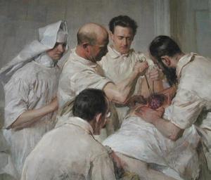 | Keywords: John Quincy Adams Wertheim bei einer Operation (cropped).jpg Artwork Creator John Quincy Adams painter langswitch Ernst Wertheim 1864-1920 at an operation Ernst Wertheim 1864-1920 bei einer Operation <br> detail 1907 Oil on canvas Institut für Geschichte der Medizin Universität Wien Anton Schaller Das Wertheimbild - Biographie eines Gemäldes Gynäkol Geburtshilfliche Rundsch 34 1994 pp 37-42 10 1159/000272331 object history exhibition history credit line accession number http //www gynecologists gr/wp-content/uploads/2011/01/ErnstWertheimGalleryVCAI011 jpg PD-old <gallery> John Quincy Adams Wertheim bei einer Operation jpg John Quincy Adams Wertheim bei einer Operation cropped 2 jpg </gallery> Ernst Wertheim John Quincy Adams painter ImageNote 1 445 97 186 198 633 540 2 Theodor Micholitsch ImageNoteEnd 1 ImageNote 2 208 60 120 216 633 540 2 Ernst Wertheim ImageNoteEnd 2 ImageNote 3 326 18 117 183 633 540 2 Wilhelm Weibel ImageNoteEnd 3 ImageNote 4 71 300 272 239 633 540 2 Anesthesiologist ImageNoteEnd 4 ImageNote 5 12 14 196 299 633 540 2 Surgical Sister Order of the Sisters of Saint Vincent of Paul ImageNoteEnd 5 |