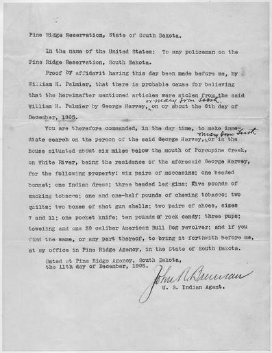 Keywords: John R. Brennan to Pine Ridge Reservation Police - NARA - 285160.tif Scope and content This is document pertains to Larceny Charges Against George Harvey December 11 1905 to December 20 1905 General notes This warrant includes a list of items alleged stolen from William H Palmier by George Harvey or Mary Iron Tooth 285160 Local identifier Department of the Interior Office of Indian Affairs Pine Ridge Agency 1878 - 09/17/1947 NARA's Central Plains Region Kansas City NREA 400 West Pershing Road Kansas City MO 64108 1905-12-11 Record group Record Group 75 Records of the Bureau of Indian Affairs 1793 - 1999 Record group ARC 404 Records of Controversies compiled 04/01/1867 - 1879 Series ARC 284971 File unit Larceny Charges Against George Harvey 12/11/1905 - 12/20/1905 File unit ARC 285159 Variant control numbers NAIL Control Number NRE-75-67-W-1 yes Other versions NARA-cooperation PD-USGov Documents in English |