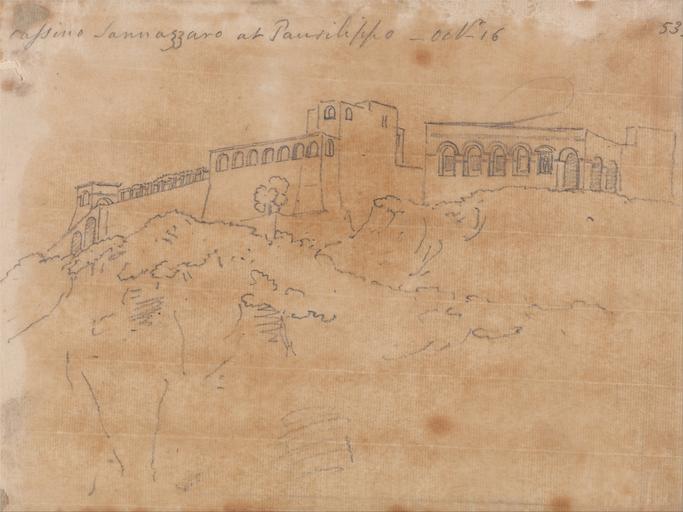 | Keywords: John Robert Cozens - Cassino Sannazzaro at Posillipo, October 16 - Google Art Project.jpg Inscribed in graphite upper left to upper center cassino Sannazzaro at Pausilippo - octr-16 ; in graphite upper right 53 ; in graphite lower left 151 Inscription _Signed_and_Dated not signed Not on View Graphite and varnish on thin slightly textured cream laid paper arches walls hills trees buildings landscape special url_id AQF1I4sj0OU8SA PD-old-100-1923 1799 Naples by John Robert Cozens Google Art Project works by John Robert Cozens Posillipo in art |