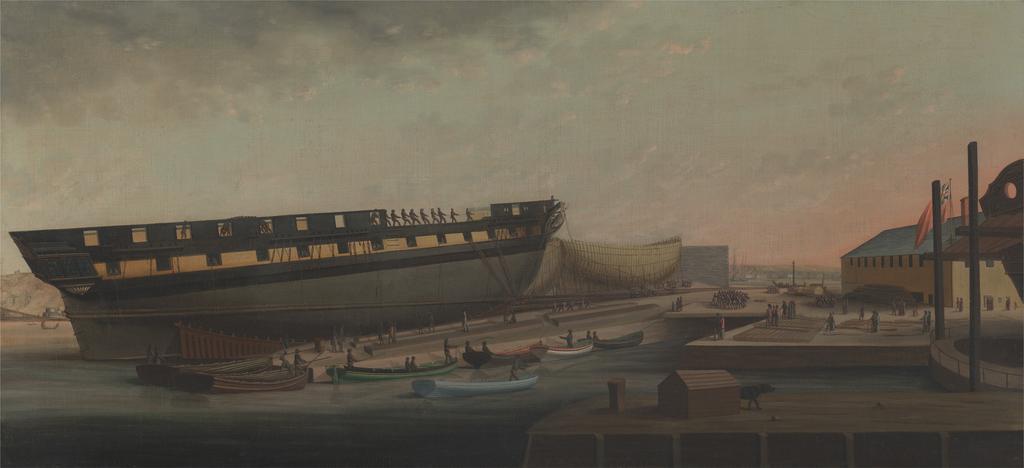 | Keywords: John Rogers - Heaving up His Majesty's Frigate 'Diana' at Blackburn's Yard, near Plymouth - Google Art Project.jpg No inscription Inscription _Signed_and_Dated Signed in ocher colored paint lower right John Rogers Pinxit Chapel Not on View Oil on canvas dog animal workers men pulling construction doghouse pier dock ships frigate genre subject landscape marine art flag boats special url_id 1wFNxkH13g4MCw PD-old-100-1923 1893 John Rogers Google Art Project works by John Rogers Paintings in the Yale Center for British Art |