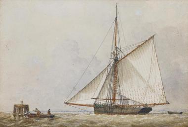 | Keywords: John Ward of Hull - A trading cutter shortening sail as members of her crew carry a mooring rope to a wooden dolphin nearby.jpg John Ward of Hull 1798-1849 other date pen indian ink and watercolour heightened with white cm 13 19 4 object history credit line accession number http //www bonhams com/auctions/18783/lot/97/ Bonhams PD-Art-100 John Ward 19th-century sailing ships in paintings Paintings of seascapes Images from Bonhams | ||||