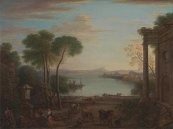 | Keywords: John Wootton - Classical Landscape - Google Art Project (2400346).jpg No inscription Inscription _Signed_and_Dated Signed and dated in black paint on urn lower left J WOOTON 1754 Not on View Oil on canvas cattle cows artist men women architecture columns architectural elements costume landscape urn boats special url_id 8wH13YbKLXjwSg PD-old-100-1923 1764 John Wootton Google Art Project works by John Wootton | ||||