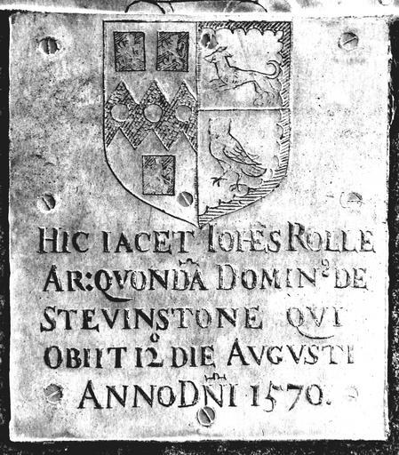 | Keywords: JohnRolleBrass1570StGilesInTheWoodDevon.JPG Monumental brass of John Rolle Esq d 1570 of Stevenstone inlaid in floor of south aisle parish church of St Giles in the Wood Devon Originally on his 2 1/2 foot high chest tomb in the chancel as reported by John Prince in his Worthies of Devon 8 7 1/4 Photo in black white negative image Own photo 2012 photo by Lobsterthermidor <span class signature-talk >talk</span> 19 28 23 November 2012 UTC Interior of St Giles in the Wood Church monuments in Devon Rolle arms Ford arms |