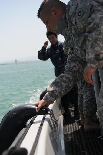 Keywords: Joint small boat operations 110711-N-MN220-076.jpg en Spc Ronnie Escoto front a soldier assigned to the Joint Task Force Guantanamo Visitors Bureau attaches a bumper to the side of a Navy small boat while transiting the bay July 11 Escoto works with sailors from the Naval Station Port Operations department in support of Joint Task Force missions 2011-07-11 Petty Officer 2nd Class Joseph Ebalo https //www dvidshub net/image/426793 110711-N-MN220-076 2011-07-12 18 07 CU PD-USGov-Military-Navy Joint Task Force Guantanamo Images from DoD uploaded by Fæ |