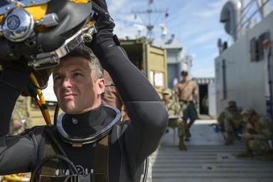 | Keywords: Joint UCT Diver Training 150117-N-YD328-039.jpg en Lt Thomas D Hallam executive officer of Underwater Construction Team One UCT ONE dons a Kirby Morgan 37 dive helmet during diver training aboard USAV Matamoros LCU-2026 Diver training is a two-week joint training evolution between UCT ONE and Underwater Construction Team Two designed to reinforce standard operating procedures qualify personnel maintain proficiency and evaluate dive protocol during scuba surface supplied and recompression chamber operations U S Navy photo by Mass Communication Specialist 2nd Class Nicholas S Tenorio/Released 2015-01-17 Petty Officer 2nd Class Nicholas Tenorio https //www dvidshub net/image/1726705 150117-N-YD328-039 2015-01-17 19 35 NAVAL AIR STATION KEY WEST FL US 3 PD-USGov-Military-Navy Naval Air Station Key West Images from DoD uploaded by Fæ |