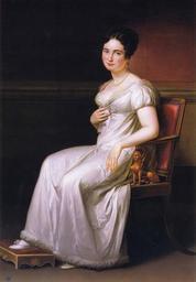 | Keywords: JOSÉ DE MADRAZO Y AGUDO - María Sandalia de Acebal y Arratia(Colección particular, 1820).jpg Retrato de Doña María Sandalia de Acebal y Arratia Firmado J de Madrazo 1820 en el centro izquierda en la cornisa Es el único retrato femenino de cuerpo entero conocido hasta hoy de mano de su autor La protagonista aparenta 25 años de edad setándose en un sillón imperio con brazos de esfinges y vistiendo un sencillo traje madreperla de talle alto y mangas abullonadas Se peina a la moda de aquellos años con rizos enmarcándole el rostro y moño trenzado luciendo un collar de cuentas en su generoso escote bordeado de encaje y apoya su pie derecho en un escabel también estilo Imperio Doña María debió nacer en Menagray Álava hacia 1798-1800 Hija de Francisco del Acebal Aguirre procurador general del Valle y Tierra de Ayala y de María Ramona de Arraria Villachica su hermano Francisco Félix del Acebal fue Senador del Reino caballero de la Orden de Alcántara y del Cuerpo Colegiado de la Nobleza de Madrid Este es un retrato atractivo con una preocupación prerromántica por la sugestión ambiental del escenario con gran habilidad en el manejo de su iluminación que gradúa desde la penumbra del margen izquierdo hacia la suave claridad del derecho resaltando con especial énfasis el volumen de la modelo cuyos bien descritos pliegues del vestido dejan adivinar su anatomía de un brazo izquierdo resuelto con una exquisita matización de claroscuro 1854 oil canvas cm 88 72 Colección particular Madrid Mirar abajo PD-Art Uploaded with UploadWizard José Madrazo |