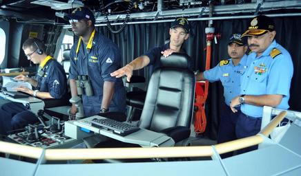 | Keywords: Joseph Gagliano, commanding officer of USS Independence (LCS 2) describes state-of-the-art features of the bridge during a ship tour for Rear Adm Ajendra B. Singh and Commodore Alok Bhatnagar from the Indian navy during RIMPAC 2014.jpg Cmdr Joseph Gagliano center commanding officer of the littoral combat ship USS Independence LCS 2 describes state-of-the-art features of the bridge during a ship tour for Rear Adm Ajendra B Singh right and Commodore Alok Bhatnagar from the Indian navy during Rim of the Pacific RIMPAC Exercise 2014 2014-07-03 http //www navy mil/management/photodb/photos/140713-N-UL721-221 JPG U S Navy PD-USGov-Military-Navy RIMPAC 2014 Alok Bhatnagar Ajendra Bahadur Singh Aboard USS Independence LCS-2 |