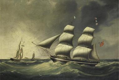 | Keywords: Joseph Heard - The Merchant Brig Rimac In Two Positions.jpg The Merchant brig Rimac in two positions off Cape Horn with another of Brocklebank's brigs in view Rimac identified from her masthead Watson`s Code flags for 268 Rimac was one of a class of twenty-one standard wooden brigs built for Brocklebanks' of Liverpool between 1822 and 1845 Launched from Brocklebank`s own yard at Whitehaven in 1834 she was registered at 215 tons and measured 90 feet in length with a 23 foot beam Ordered specifically for the company`s Peru route she spent much of her life sailing to the many ports on the western coast of South America and rounded the Horn“ no less than fifty-six times a remarkable achievement for any sailing vessel particularly a tiny brig After a long and trouble-free career she was inbound for Dundee with a cargo of guano on 28th February 1862 when she was driven aground near Kilrush in the south-west of Ireland Although successfully refloated she had suffered some hull damage and perhaps for this reason Brocklebanks' sold her to Nuttall Co of Liverpool in 1864 Ten years later on 12th December 1874 by which date she was owned by W Hayes of Blythe she was wrecked near North Somercotes south of Grimsby 1854 oil canvas cm 63 90 5 object history credit line signed 'J Heard' and dated 1854 lower left accession number 1 http //www arcadja com/auctions/en/heard_joseph/artist/12999/ Bonhams via ARCADJA auction results<br/>2 http //www bonhams com/auctions/16837/lot/98/ Bonhams PD-old-auto-1923 1859 Joseph Heard Rimac ship 1834 Images from Bonhams 19th-century sailing ships in paintings 19th-century paintings location missing 1854 oil on canvas paintings |