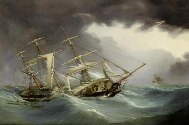 | Keywords: Joseph Heard - painting of the Lord Ashburton being driven by the gale.jpg 1857 1859 oil on canvas cm 61 92 object history credit line The full-rigged Lord Ashburton was built at Workington in 1854 for Girvin Co of Liverpool and measured at 897 tons During her short life she traded out of Liverpool to North America mainly the Maritime Provinces of Canada She was however in Gibraltar in December 1856 from where she sailed for Toulon to load a cargo for Saint John New Brunswick On 19th January 1857 when nearly at her destination she was caught in a savage hurricane off Grand Manan Island in the Bay of Fundy just a few miles out from Saint John and sunk All her officers were drowned with only eight of twenty-nine crew saved <ref>http //www bonhams com/auctions/18922/lot/93/ Bonhams</ref><small> reflist </small> accession number 1 http //www wreckhunter net/DataPages/lordashburton-dat htm wreckhunter net<br/>2 http //www bonhams com/auctions/18922/lot/93/ Bonhams London 13 Sep 2011 lot 93 PD-old-auto-1923 1859 Joseph Heard Lord Ashburton ship 1843 Sea storms in art 19th-century sailing ships in paintings 19th-century paintings location missing Images from Bonhams |