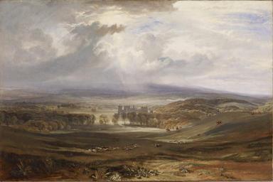 | Keywords: Joseph Mallord William Turner - Raby Castle, the Seat of the Earl of Darlington - Walters 3741.jpg Before he painted Romantic subjects drawn from classical biblical literary and contemporary sources Turner specialized in topographical views This work commissioned by the third earl of Darlington is one of Turner's most successful house portraits It is also one of the first works in which he fully exploits the dramatic potential of the sky The earl an avid sportsman who reportedly hunted six days a week may have influenced Turner's rendering of the scene When the painting was first exhibited at the Royal Academy in 1818 it included a mounted huntsman in the foreground Turner subsequently painted over this figure after his work had been denounced as a detestable fox-hunting scene Raby Castle a ca 1380 structure is located in County Durham England 1817 Oil on canvas cm 119 180 6 ; Framed cm 156 85 217 17 17 78 accession number 37 41 2067 3rd Earl of Darlington 1817-1818 by commission Widow of the Duke of Cleveland date and mode of acquisition unknown Mssrs Wallis French Gallery London 1899 by purchase from the widow of the Duke of Cleveland W Scott and Sons Montreal 1899 exhibited there November 1899 Henry Walters Baltimore ca 1899 by purchase Walters Art Museum Henry Walters Acquired by Henry Walters ca 1899 Exhibited at the Royal Academy summer exhibition 1818 J M W Turner National Gallery of Art Washington; Dallas Museum of Art Dallas; The Metropolitan Museum of Art New York 2007-2008 19th Century Masterpieces from the Walters Art Museum Santa Barbara Museum of Art Santa Barbara; Jack S Blanton Museum of Art Austin 2010-2011 Exhibition title unknown held at the Royal Academy Royal Academy of Arts London 1818 Exhibition title unknown held at The French Gallery London The French Gallery London 1899 Exhibition title unknown held at W Scott and Sons Montreal W Scott and Sons Montreal 1899 place of origin The Hague Netherlands Otherversion File Joseph Mallord William Turner 071 jpg Walters Art Museum license 2D Paintings by Joseph Mallord William Turner in the United States Paintings in the Walters Art Museum Raby Castle in art |
