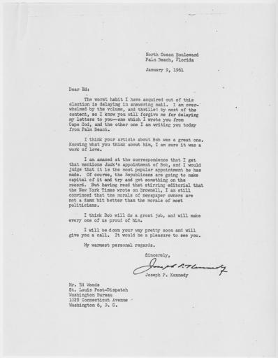 | Keywords: Joseph P. Kennedy Letter on Robert F. Kennedy's Appointment as Attorney General January 9, 1961 - NARA - 194014.jpg Scope and content Letter from Joseph P Kennedy Sr to Ed Woods of the St Louis Post Dispatch concerning Robert F Kennedy's appointment as Attorney General of the United States General notes 194014 Local identifier Kennedy Robert F Robert Francis 1925-1968 NARA-Author Kennedy Joseph P Joseph Patrick 1888-1969 Author 1397401 <br /> John F Kennedy Library NLJFK Columbia Point Boston MA 02125-3398 1961-01-09 Record group Collection JFK-RFK Robert F Kennedy Papers 1937 - 06/06/1968 Record group ARC 1169 Robert F Kennedy Papers; Senate Papers; Correspondence Personal File compiled 1964 - 1968 Series ARC 194012 File unit Robert F Kennedy Papers Senate Papers Correspondence Personal File Kennedy Family 1965 01/1965 - 12/1965 File unit ARC 194013 Variant control numbers NAIL Control Number NLK-RFK-SNFILESCORPC-KENFAM1965-7E Other versions <gallery> File Joseph_P _Kennedy_Letter_on_Robert_F _Kennedy's_Appointment_as_Attorney_General_January_9 _1961_-_NARA_-_194014 tif tif File Joseph_P _Kennedy_Letter_on_Robert_F _Kennedy's_Appointment_as_Attorney_General_January_9 _1961_-_NARA_-_194014 jpg jpg </gallery> NARA-cooperation PD-USGov Robert F Kennedy Joseph Kennedy correspondence Letters written messages |