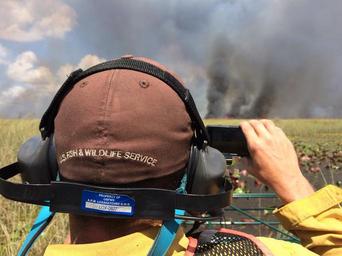| Keywords: fire prescribed fire prescribedfire loxahatchee airboat firefighters outdoor USFWS firefighter Josh Havird takes a photo of a large (18,500 acre) prescribed fire at A.R.M Loxahatchee NWR, July 6th, 2016. Prescribed fire is an important management tool that reduces the risk and impact of wildfires to the neighboring communities while improving the quality of the habitat. Airboats and helicopters are used by firefighters when conducting prescribed fires in large marshes in the southeast. - Photo Credit: Joseph Whelan (USFWS) USFWS firefighter Josh Havird takes a photo of a large (18,500 acre) prescribed fire at A.R.M Loxahatchee NWR, July 6th, 2016. Prescribed fire is an important management tool that reduces the risk and impact of wildfires to the neighboring communities while improving the quality of the habitat. Airboats and helicopters are used by firefighters when conducting prescribed fires in large marshes in the southeast. - Photo Credit: Joseph Whelan (USFWS) |