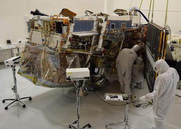 | Keywords: jpss- 1 jpss1 nesdis noaa satellites noaasatellites satellite December 9, 2015 The solar panel array on NOAA’s polar-orbiting satellite JPSS-1 spacecraft successfully completed its fit check at Ball Aerospace and Technologies Corp. The solar array is folded up at launch and deploys on orbit, resembling a giant black wing and generating more than 2775 watts of power for NOAA’s JPSS-1 satellite. Photovoltaic cells in the solar array derive electricity from sunlight and convert solar radiation into direct current electricity. The JPSS-1 photovoltaics in the solar panel array will power the entire satellite including all of the instruments, computers, data processors, and telecommunications equipment. Credit: Ball Aerospace and Technologies December 9, 2015 The solar panel array on NOAA’s polar-orbiting satellite JPSS-1 spacecraft successfully completed its fit check at Ball Aerospace and Technologies Corp. The solar array is folded up at launch and deploys on orbit, resembling a giant black wing and generating more than 2775 watts of power for NOAA’s JPSS-1 satellite. Photovoltaic cells in the solar array derive electricity from sunlight and convert solar radiation into direct current electricity. The JPSS-1 photovoltaics in the solar panel array will power the entire satellite including all of the instruments, computers, data processors, and telecommunications equipment. Credit: Ball Aerospace and Technologies |