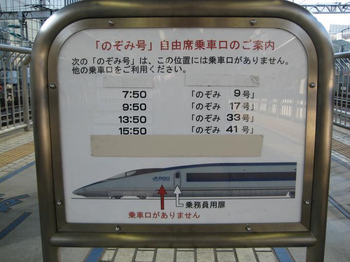 | Keywords: JR500 TOKYO STATION.JPG en Direction board for Shinkansen 500 series at Tokaido Shinkansen Tokyo station It has been described that the entrance to a platform is not here ja 海道新幹線 京駅1号車付近(博多寄り)にあった案内 乗車口がないことを記載している Sotetsuyama's file Sotetsuyama 2008-02-23 Shinkansen 500 Interior of Tokyo Station Information boards at train stations in Japan |
