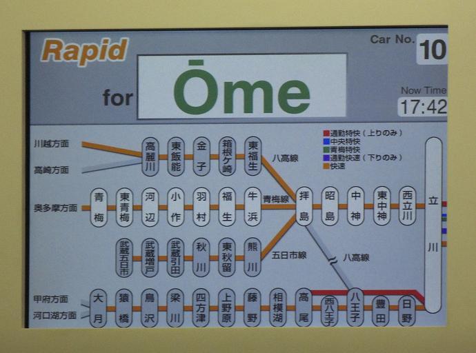 | Keywords: JR East Ome Display C2154.jpg Changeable display on JR East Ome Line in Tokyo Japan Display changes to indicate location in Japanese and the Latin alphabet to show route to report delays and to present information such as prohibition of cell-phone use I took this photo and contribute my rights in the file to the public domain; individuals and organizations retain rights to images in it own Fg2 JR East E233 | ||||