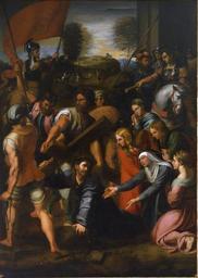 | Keywords: Juan Carreno de Miranda 024.jpg El lienzo representa a Cristo cargando con la cruz y camino del Monte Calvario donde sería crucificado y es una copia pintada en el siglo XVII por Juan Carreño de Miranda de la obra El Pasmo de Sicilia o Caída en el camino del Calvario que fue pintada hacia 1515 ó 1517 por Rafael Sanzio y que se conserva actualmente en el Museo del Prado de Madrid España 1674 oil canvas Size cm 235 325 Institution Real Academia de Bellas Artes de San Fernando http //www realacademiabellasartessanfernando com/assets/docs/guia_museo/guia_museo pdf object history exhibition history credit line accession number 745 http //ceres mcu es/pages/Main PD-old-100 checked Paintings by Juan Carreño de Miranda in the Royal Academy of Fine Arts of San Fernando 17th-century paintings in the Royal Academy of Fine Arts of San Fernando Baroque paintings of Jesus Christ bearing the Cross 17th-century paintings of the Passion of Christ Baroque paintings in Madrid Files uploaded by Shakko from various sources Artwork after Raffaello Sanzio |
