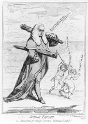 | Keywords: Judge Thumb.jpg JUDGE THUMB or -- Patent Sticks for Family Correction Warranted Lawful a 1782 caricature by James Gillray Edited from image http //memory loc gov/master/pnp/cph/3c10000/3c14000/3c14300/3c14396u tif found on the Library of Congress website Judge Thumb says Who wants a cure for a nasty Wife Here's your nice Family Amusement for Winter Evenings Who buys here Woman says Help Murder for God sake Murder Man says Murder hey it's Law you Bitch it's not bigger than my Thumb Creator James Gillray ---- Bibligraphic information at LoC site TITLE Judge Thumb or - patent sticks for family correction warranted lawful CALL NUMBER PC 1 - 6123 A size P P REPRODUCTION NUMBER LC-USZ62-114396 b w film copy neg No known restrictions on publication SUMMARY Judge Buller walking in foreground carrying bundles of rods; in the background a man with a rod raised over his head is about to strike a woman who is running away from him MEDIUM 1 print etching CREATED/PUBLISHED London pubd by H Humphrey 1782 Nov 27th CREATOR Gillray James 1756-1815 artist SUBJECTS Buller Francis 1746-1800 Family violence--England--1780-1790 FORMAT Cartoons British 1780-1790 Etchings British 1780-1790 DIGITAL ID b w film copy neg cph 3c14396 http //hdl loc gov/loc pnp/cph 3c14396 CARD 95508959 Source Library of Congress Prints and Photographs Division Washington D C 20540 USA http //hdl loc gov/loc pnp/cph 3c14396 1782-11-27 Creator James Gillray PD-old-100 1782 cartoons James Gillray 18th-century caricatures 1782 Wigs judicial dress Bundles of sticks Rules of thumb Sir Francis Buller 1st Baronet |