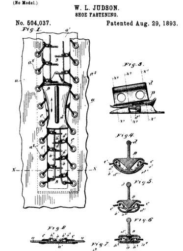 Keywords: Judson improved shoe fastening 1893.png en Whitcomb Judson's improved shoe fastener 1893 United States Patent Office United States Patent Office 1893-08-29 PD-USGov Whitcomb L Judson