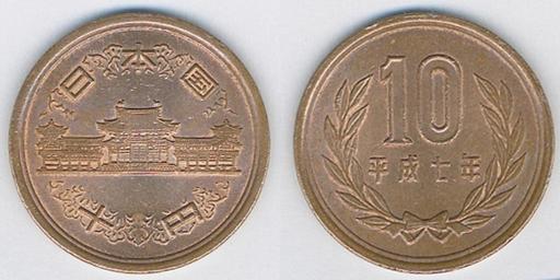 | Keywords: JuEnDamaBothSidesWP.jpg 10 Yen coin of Japan Left Inscription 日 国 Nippon-koku 十円 Ten yen Design Byodoin a Buddhist temple in Uji Kyoto Prefecture Japan Right Inscription 10 value of coin in yen 平成七年 The year Heisei 7 I scanned this coin One coin two scans 2005-09-03 own assumed Fg2 See also Image JuEnDamaByodoinWP jpg Image JuEnDamaEvergreenTreeWP jpg 10 yen coins Phoenix Hall Byodo-in in art | ||||