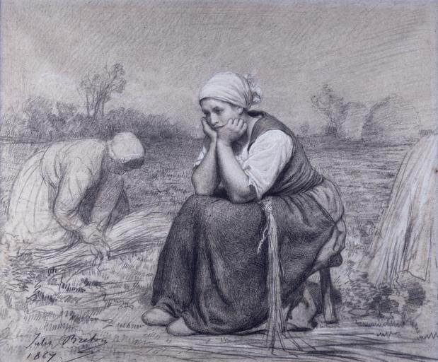 Keywords: Jules Adolphe Aimé Louis Breton - Repose - Walters 37902.jpg This drawing dates from perhaps the most formally successful decade of Breton's career The artist represents a young woman lost in dreamy contemplation as she pauses for rest during the harvest Her fellow harvesters continue to work behind her and there are haystacks visible in the distance The contrast is notable between the highly finished manner of the resting woman and the far sketchier treatment of the landscape background and secondary figures The resting woman is characteristic of Breton's classicizing treatment of form in the 1860s but it may also reflect an awareness of more recent sources 1867 charcoal and white chalk on blue thick heavily textured cartridge-style laid paper; the blue color comes from blue and red textile fibers in a white furnish cm 47 6 57 5 accession number 37 902 20842 William T Walters Baltimore before 1879 mode of acquisition unknown Henry Walters city Baltimore Walters Art Museum Henry Walters Acquired by William T Walters before 1879 Jules Breton/1867 in charcoal lower right; 823 on reverse of frame upper right; Walters 209 on label attached to reverse of frame upper left; watermarked MFDT in block letters The Essence of Line Jules Breton and the French Rural Tradition The Dixon Gallery and Gardens Memphis; The Sterling and Francine Clark Art Institute Williamstown; Joslyn Art Museum Omaha 1982-1983 place of origin France Walters Art Museum license 2D The Essence of Line Paintings by Jules Breton Temporary for Cat-a-lot - Female humans Black and white photographs of hand gestures Hands on head People resting Sitting with hand on head Kerchiefs in art Drawings in the Walters Art Museum 1867 drawings Contemplation |