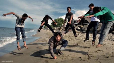 Keywords: jump action group teenagers people indonesia beach happy