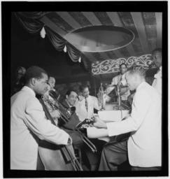 | Keywords: Junior Raglin, Lawrence Brown, Johnny Hodges, Duke Ellington, Ray Nance, Sonny Greer, Fred Guy, and Harry Carney, Aquarium, New York, N.Y., ca. Nov. 1946 (William P. Gottlieb 02371).jpg Gottlieb William P 1917- photographer Portrait of Junior Raglin Lawrence Brown Johnny Hodges Duke Ellington Ray Nance Sonny Greer Fred Guy and Harry Carney Aquarium New York N Y ca Nov 1946 1 negative b w ; 2 1/4 x 2 1/4 in Caption from Down Beat On the cover of this issue Duke Ellington poses with a group of his sidemen for staff photographer Bill Gottlieb From left to right you can find Junior Raglin bass; Lawrence Brown trombone; Johnny Hodges alto sax; the Duke himself Ray Nance trumpet and Sonny Greer drums The Ellington orchestra will be presented in concert by Down Beat on November 10 at the Civic Opera in Chicago Notes Gottlieb Collection Assignment No 038 Reference print available in Music Division Library of Congress Purchase William P Gottlieb Forms part of William P Gottlieb Collection Library of Congress In Duke group on the cover Down Beat v 13 no 23 Nov 4 1946 Subjects Raglin Junior 1917-1955 Brown Lawrence 1907-1988 Hodges Johnny Ellington Duke 1899-1974 Nance Ray 1913- Greer Sonny Guy Fred Carney Harry Duke Ellington Orchestra Jazz musicians--1940-1950 Composers--1940-1950 Pianists--1940-1950 Big bands--1940-1950 Aquarium Format Portrait photographs--1940-1950 Cityscape photographs--1940-1950 Film negatives--1940-1950 Rights Info Mr Gottlieb has dedicated these works to the public domain but rights of privacy and publicity may apply http //lcweb2 loc gov/diglib/ihas/html/gottlieb/gottlieb-copyright html lcweb2 loc gov/diglib/ihas/html/gottlieb/gottlieb-copyrig Repository negative Library of Congress Prints Photographs Division Washington D C 20540 USA http //hdl loc gov/loc pnp/pp print hdl loc gov/loc pnp/pp print reference print Library of Congress Music Division Washington D C 20540 USA http //loc gov/rr/perform/ loc gov/rr/perform/ Part Of William P Gottlieb Collection DLC 99-401005 General information about the Gottlieb Collection is available at http //lcweb2 loc gov/diglib/ihas/html/gottlieb/gottlieb-home html lcweb2 loc gov/diglib/ihas/html/gottlieb/gottlieb-home html Persistent URL http //hdl loc gov/loc music/gottlieb 02371 hdl loc gov/loc music/gottlieb 02371 Call Number LC-GLB23- 0237 http //lcweb2 loc gov/diglib/ihas/loc natlib gottlieb 02371/enlarge html page 1 section ver01 size 1024 from Creator William P Gottlieb 1946-11 PD-Gottlieb Photographs by William P Gottlieb Duke Ellington Johnny Hodges Aquarium Jazz Club Junior Raglin |