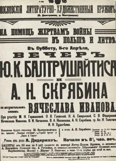 Keywords: JurgisBaltrusaitis and AleksandrSkriabin.jpg Playbill of the evening of poet Jurgis Baltrušaitis'poetry and Akeksandr Skriabin's music in Moscow 1915 Source Jurgis Baltrušaitis Poezija Vilnius Vaga 1967 book Scan Alma Pater 22 23 12 Jun 2005 UTC PD-old Jurgis Baltrušaitis 1915 in Moscow Cyrillic writing Music in 1915 Alexander Scriabin