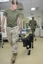 | Keywords: K9 patient 140113-N-LE393-111.jpg en U S Marine Corps Cpl Johanna Robbins a military working dog handler with the 13th Marine Expeditionary Unit law enforcement detachment walks with Quick a black lab explosives search dog following a veterinary procedure to clean out his ear canals Quick had earwax dirt and a yeast infection in his ears U S Navy photo by Mass Communication Specialist 1st Class Eric Dietrich/Released 2014-01-13 Petty Officer 1st Class Eric Dietrich https //www dvidshub net/image/1150217 140113-N-LE393-111 2014-01-14 08 03 CAMP LEMONNIER DJ PD-USGov-Military-Navy 13th Marine Expeditionary Unit Camp Lemonnier Images from DoD uploaded by Fæ |