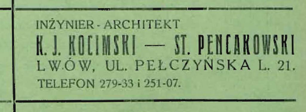 | Keywords: K. J. Kocimski - St. Pencakowski, advertising (Zycie techniczne, № 7-8, 1936).jpg uk Реклама а хітекто ів К Коцімського і С Пенцаковського у часописі Zycie techniczne 7-8 1936 Zycie techniczne 7-8 1936 author 1936 Architects of Lviv Advertisements in Lviv Vitovskoho Street Lviv 1936 advertisements PD-old |