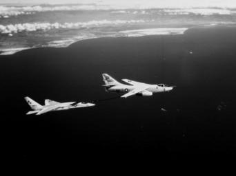 | Keywords: KA-3B VAH-4 refueling RA-5C RVAH-13 c1965.jpeg A U S Navy North American RA-5C Vigilante BuNo 149278 from Reconnaissance Heavy Attack Squadron 13 RVAH-13 Bats refuels from a Douglas KA-3B Skywarrior BuNo 142653 from Heavy Attack Squadron 4 VAH-4 Fourrunners Both aircraft were assigned to Attack Carrier Air Wing 11 CVW-11 aboard the aircraft carrier USS Kitty Hawk CVA-63 for a deployment to Vietnam from 19 October 1965 to 13 June 1966 <br>The KA-3B 142653 was shot down on 12 April 1966 by Chinese Mikoyan-Gurevitch MiG-19 fighter over Luichow Peninsula in Kuangtung Province Hainan Island China after having strayed into Chinese airspace approximately 21º8 ™N 111º17 ™E The crew was killed The RA-5C 149278 was later shot down by flak over Ha Tinh Province North Vietnam on 5 May 1968 while in service with RVAH-1 CVW-9 aboard USS Enterprise CVAN-65 Both crew ejected and became prisoners of war http //collections naval aviation museum/emuwebdoncoms/pages/doncoms/Query php U S Navy National Museum of Naval Aviation photo No http //collections naval aviation museum/emuwebdoncoms/pages/doncoms/Display php irn 16002849 QueryPage 2Femuwebdoncoms 2Fpages 2Fdoncoms 2FAdvQuery php 1996 253 3579 Official U S Navy photo http //www history navy mil/our-collections/photography/numerical-list-of-images/nhhc-series/nh-series/USN-1115000/USN-1115560 html USN 1115560 from the U S Navy http //www history navy mil Naval History and Heritage Command 1965-02-20 U S Navy PD-USGov-Military-Navy Douglas KA-3B Skywarrior North American RA-5C Vigilante Aerial refueling Reconnaissance Heavy Attack Squadron 13 United States Navy |